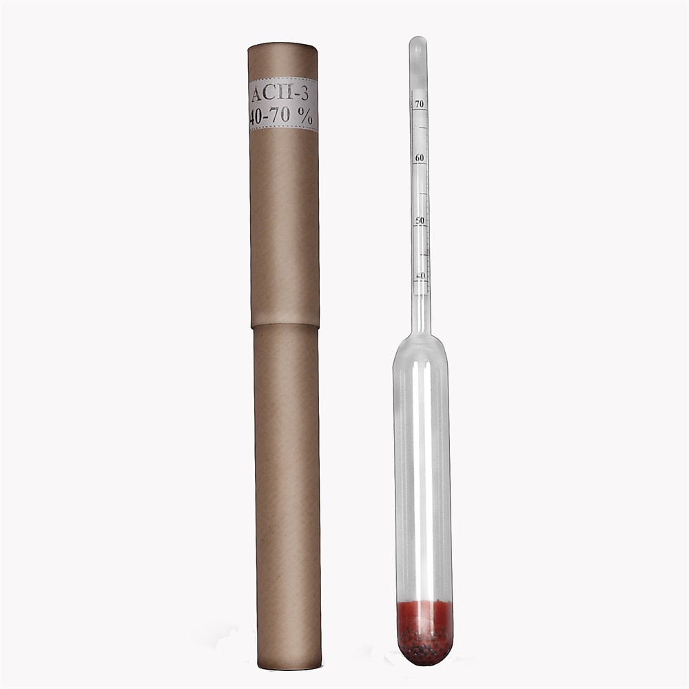 Тип прибора: АСП-3 (ГОСТ 18481-81) Диапазон показаний (объемная доля, %): 40-70% об. Деления: 1% об. Предел допустимой погрешности: ±0,5% об. Высота: 190 мм
