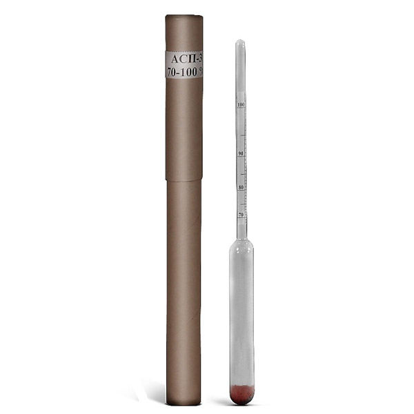 Ареометр АСП-3 70-100 – профессиональный лабораторный спиртомер, максимально точно определяющий объемную часть этилового спирта, содержащегося в водном растворе. Данный спиртомер показывает процентное содержание спирта в диапазоне от 70 до 100 процентов.