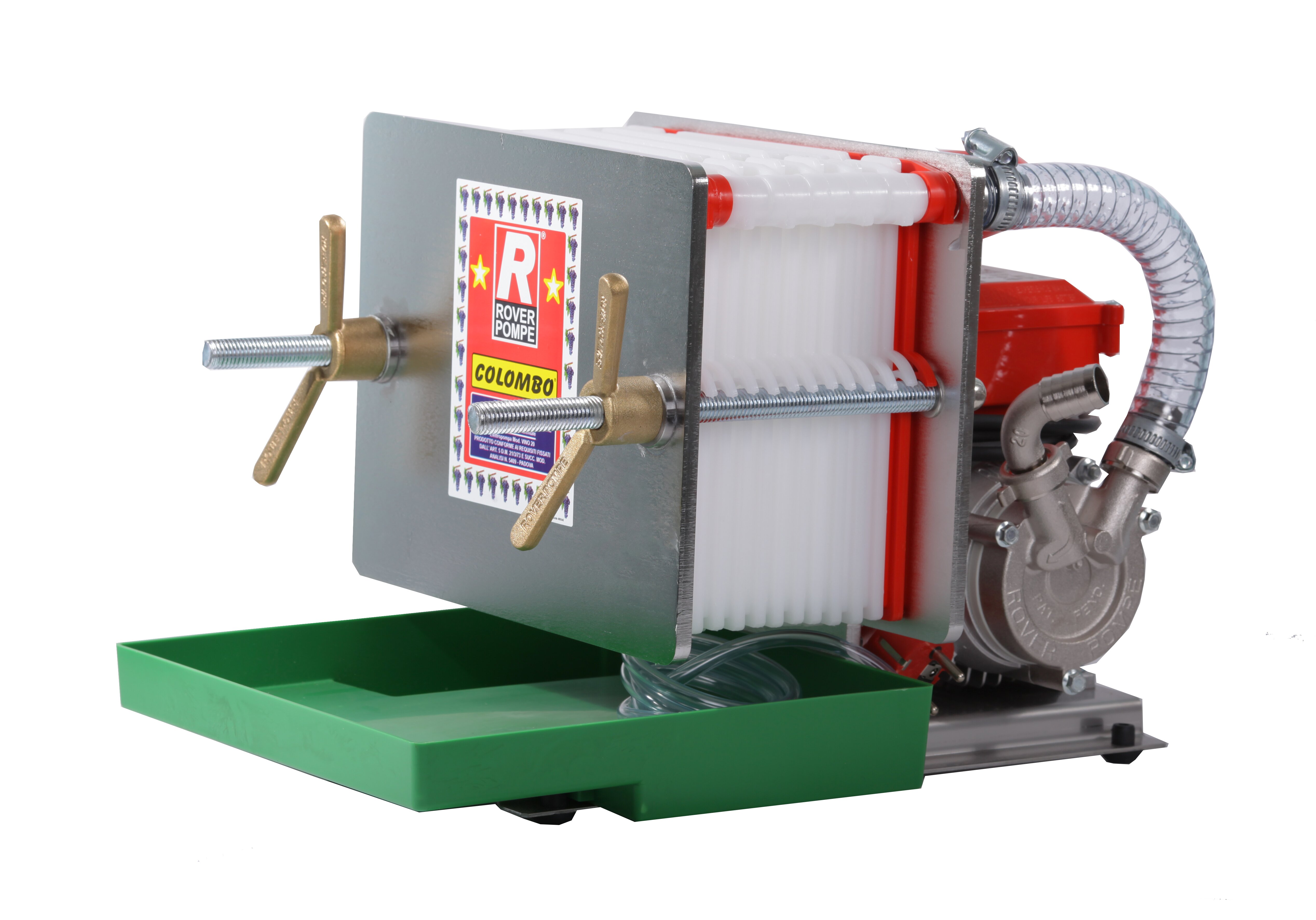 Фильтр пресс Colombo 12 из нержавеющей стали на 12 фильтрующих пластин - незаменимый помощник в виноделии и пивоварении. Он состоит из специального электронасоса и фильтрующей системы. Из нержавеющей стали изготовлены следующие детали фильтра пресса: опора, на которой крепятся насос и фильтрующая система, детали фильтрующей системы, штуцера насоса. Сам насос изготовлен из бронзы и покрыт никелем.