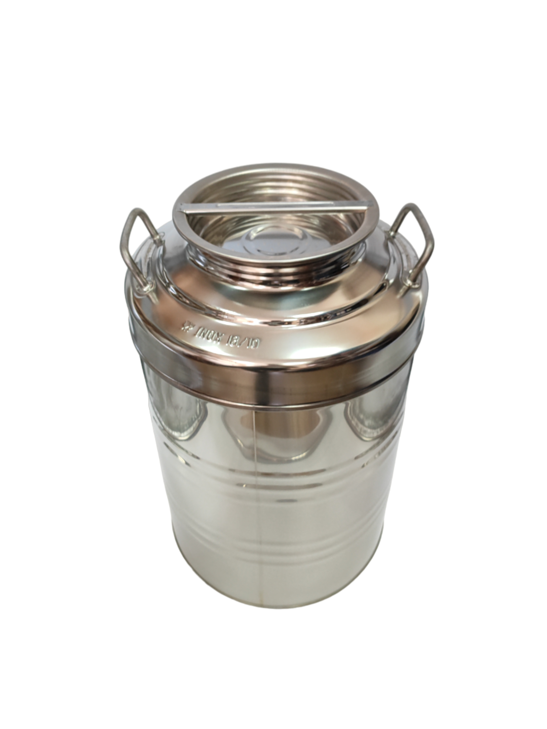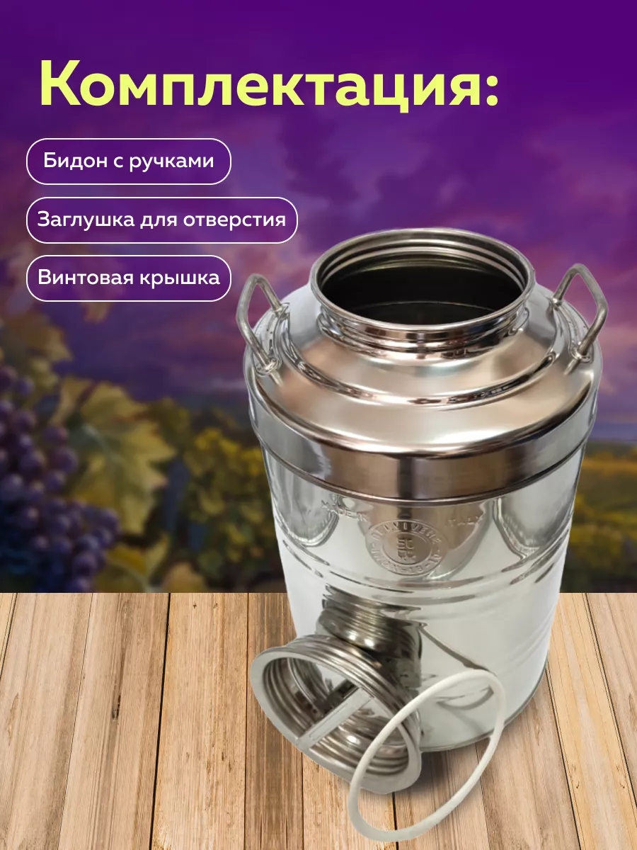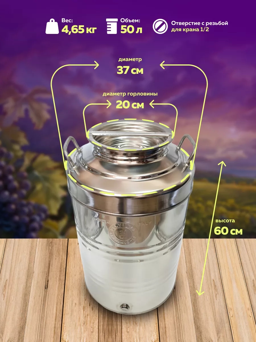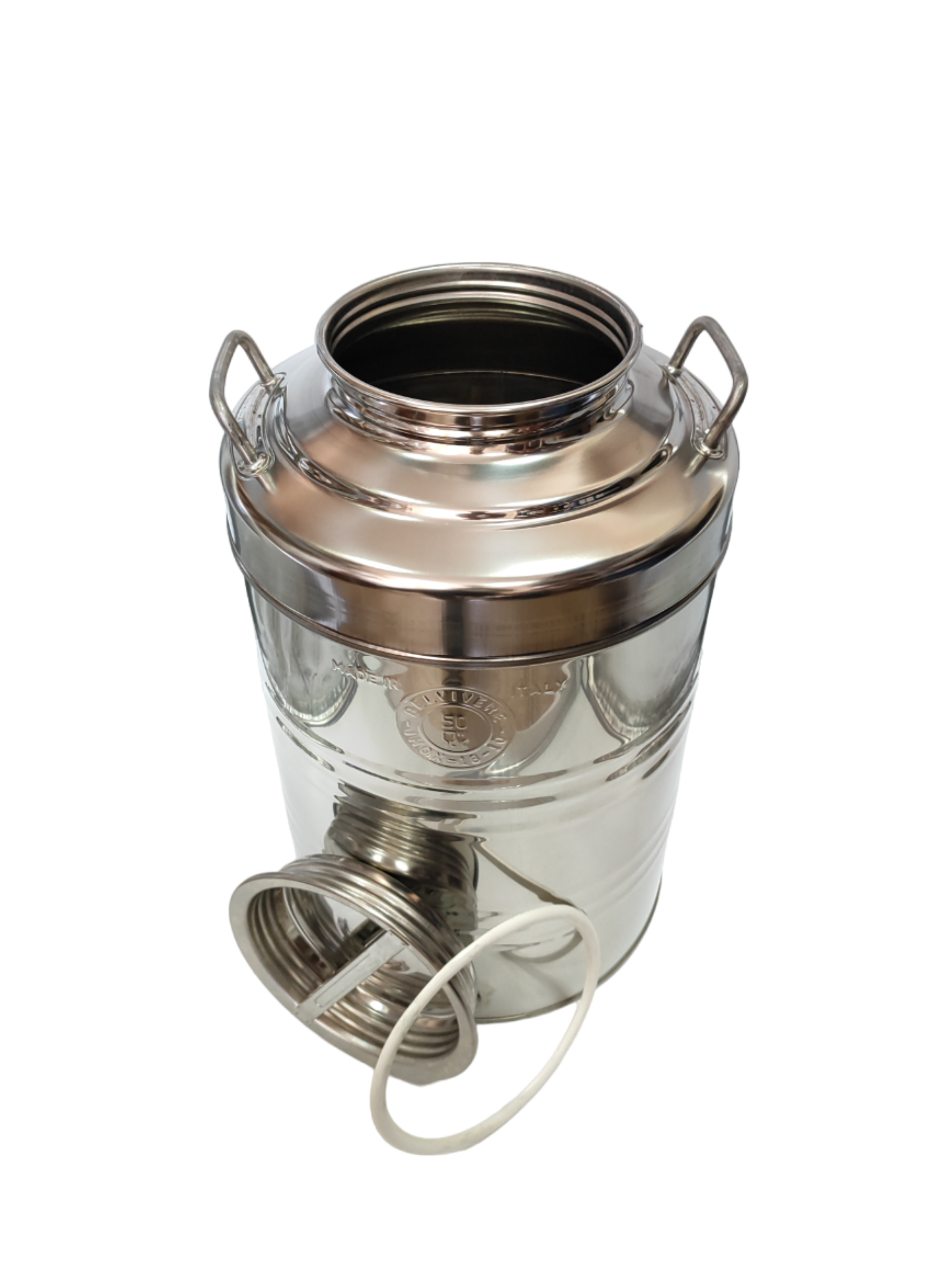 Бидон 50 литров предназначен для длительного хранения пищевых и непищевых продуктов, в том числе алкогольных напитков (самогон, водка, спирт пищевой, настойка, бренди, коньяк, виски, кальвадос, чача), воды, гидролатов, масла и соков. Может использоваться в качестве перегонного куба для получения самогона или в качестве емкости для брожения.