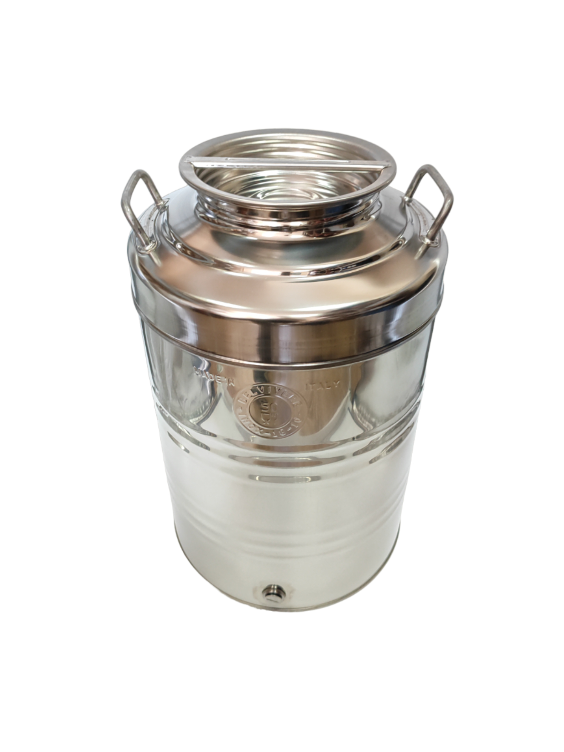 Бидон изготовлен из нержавеющей стали 18/10 (AISI 304) по классическим технологиям итальянским производителем Polsinelli, выпускающем оборудование для домашнего виноделия с 1957 года, что гарантирует высокое качество и долгий срок ее службы.