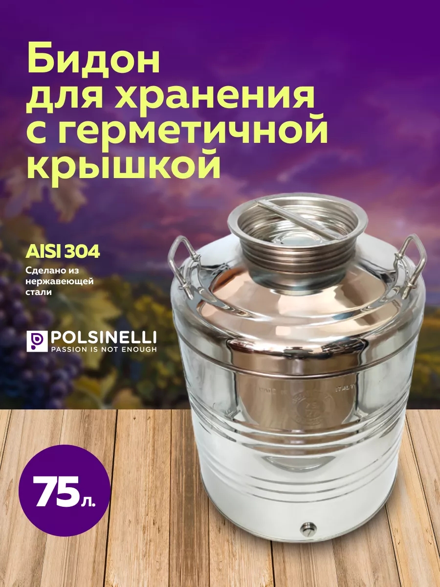 Бидон изготовлен из нержавеющей стали 18/10 (AISI 304) по классическим технологиям итальянским производителем Polsinelli, выпускающем оборудование для домашнего виноделия с 1957 года, что гарантирует высокое качество и долгий срок ее службы.