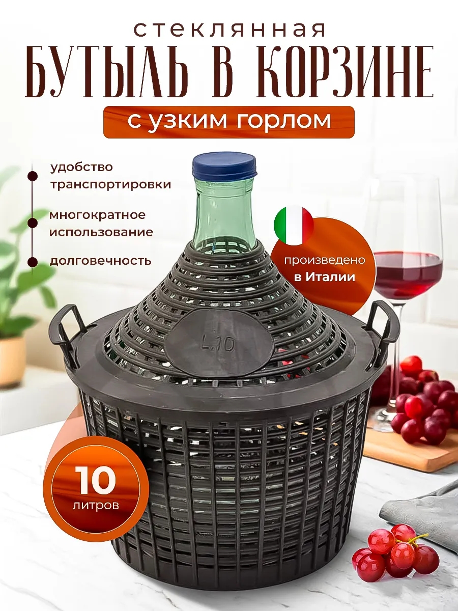 Бутыль в пластиковой корзине 10 литров используется для хранения или транспортировки вина, самогона и других напитков. Стеклянная бутыль защищена пластиковой корзиной, имеющей ручки для переноски. Кроме того, пластиковая корзина способна защитить бутыль не только от повреждений, но и от ультрафиолета. Бутыль изготовлена из качественного, экологичного стекла. Комплектуется пластиковой крышкой.
