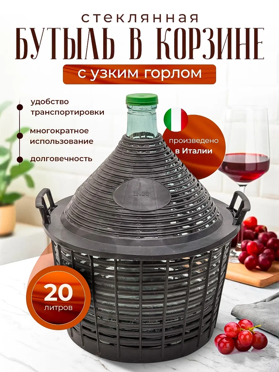 Бутыль стеклянная 20 л, с узким горлом в корзине, для вина
