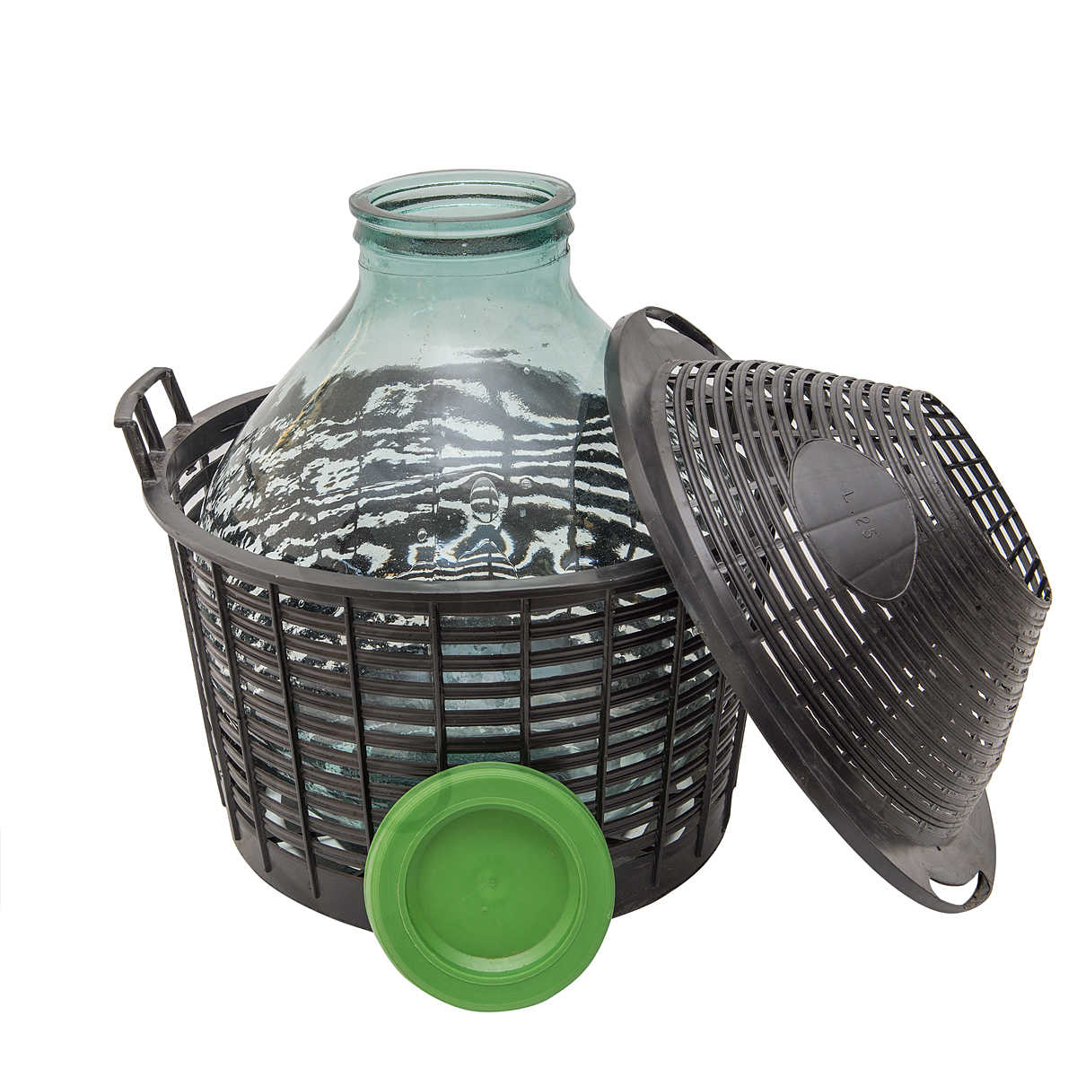 Бутыль в пластиковой корзине 25 литров с широким горлом используется для хранения или транспортировки вина, самогона и других напитков. Стеклянная бутыль защищена пластиковой корзиной, имеющей ручки для переноски. Кроме того, пластиковая корзина способна защитить бутыль не только от повреждений, но и от ультрафиолета. Бутыль изготовлена из качественного, экологичного стекла. Комплектуется пластиковой крышкой.