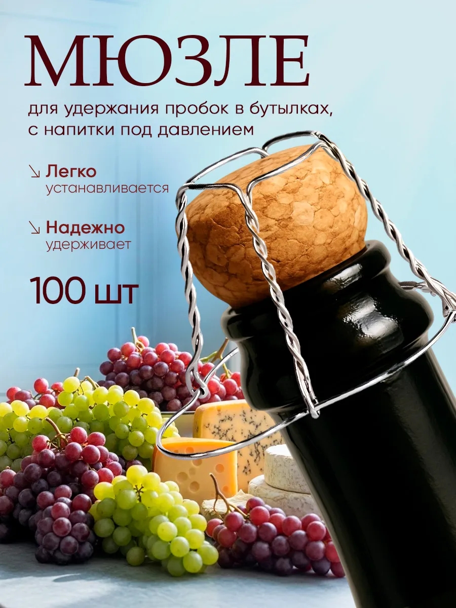 В наборе 100 штук мюзле без плакетки, которые легко устанавливаются на бутылку. Они надежно удерживают пробку на месте, обеспечивая безопасность при транспортировке и хранении бутылок. На производстве мюзле накручивают на бутылки станки, однако в домашнем виноделии Вы без труда сделаете это вручную. Мюзле без плакетки как правило используют для укупоривания бутылок пластиковыми пробками.