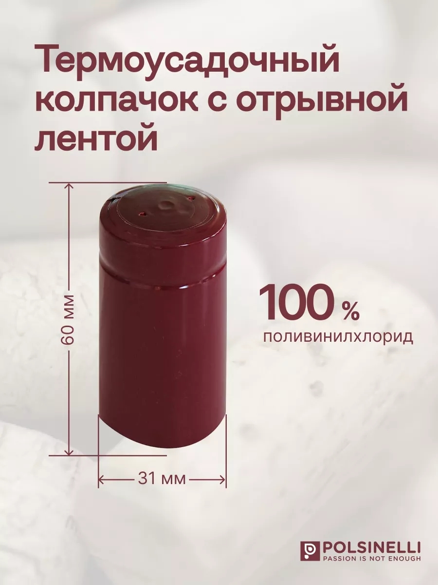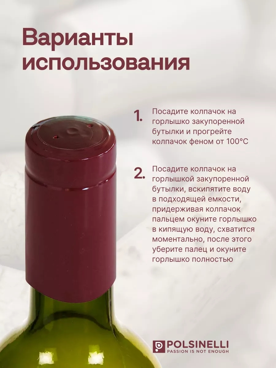 Термоусадочные колпачки Polsinelli с отрывной лентой используются для плотного закрытия винных бутылок и создания контроля oт вскрытия. Использование колпачка позволяет подтвердить, что бутылка с напитком ранее не вскрывалась. Также он является элементом декора при оформлении домашних напитков, добавляет эксклюзивность и неповторимость Вашему продукту. Eго можно использовать для бутылок с самыми разнообразными спиртными напитками - вином, самогоном, наливками и другими. Термоусадочный колпачок придает бутылке завершенный вид, так как она будет выглядеть аналогично выпущенной в промышленных условиях.
