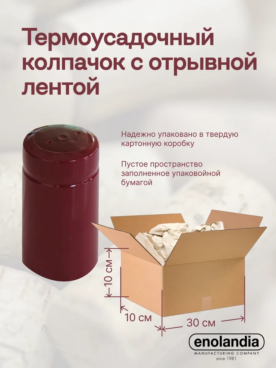 Защищенное таким образом вино непременно станет прекрасным подарком родным и близким! Термоусаживаемые крышки чрезвычайно просты в использовании даже без профессионального оборудования. Производятся из пленки, которая уменьшается при воздействии на нее высокой температуры. Отличаются простотой использования - колпачок одевается на горлышко, после чего нагревается феном, паром или горячей водой, в результате чего уменьшается в размерах. Легко снимаются, т.к. имеют специальную перфорацию на поверхности, что облегчает их снятие при открытии винной бутылки! Колпачок рассчитан на стандартные винные бутылки бордо.